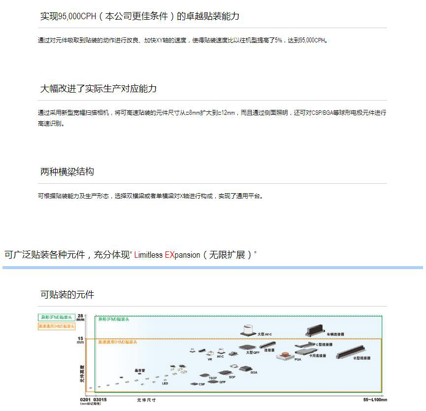 2.大幅升級“高速通用一體化貼裝頭”,在世界同級別產品中高水平的多功能型表面貼片機.
