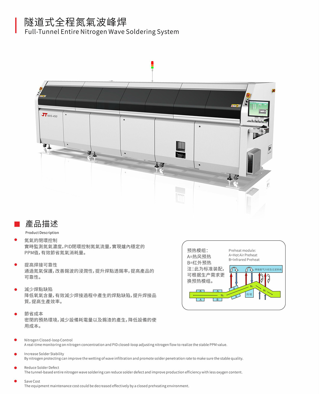 隧道式氮氣波峰焊,通過降低爐內(nèi)氧氣含量,有效減少焊接缺陷,保證焊接品質(zhì),提高生產(chǎn)效率。